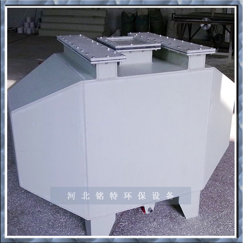 該裝置把(bǎ)鉻酸槽排放帶出的鉻酸霧由引風機采用負壓形(xíng)式壓入回收器內,裝置內有均風板把帶有鉻酸霧的廢氣進行均風,通過均風板的迎麵風速(sù)一般在(zài)2~3m/s範圍,然後再有(yǒu)擋水(shuǐ)板把鉻酸霧分離(lí)下,使鉻酸霧沿著擋水板的槽口流淌下來。鉻酸流入回收器下部的集液(yè)槽,集液槽中的鉻酸自然流入底部的液封容器裏。